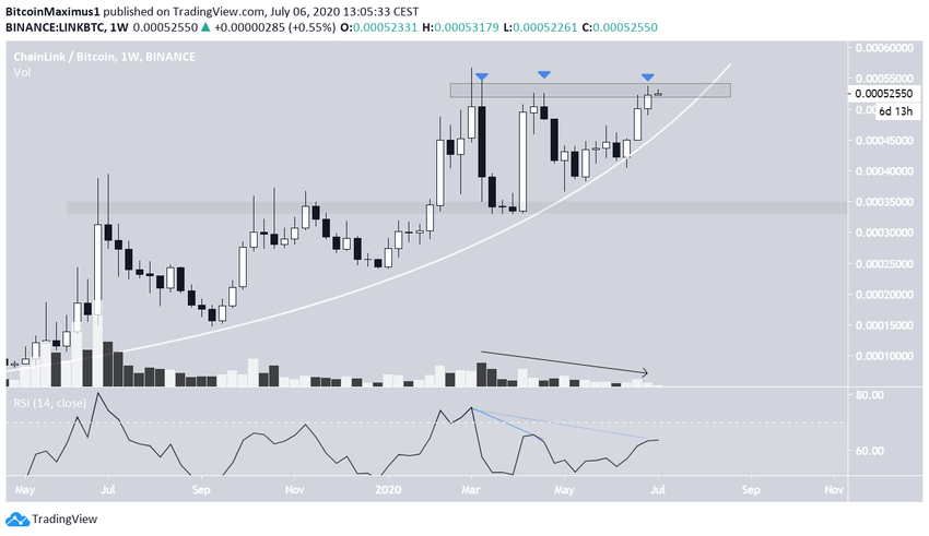 Курс Chainlink (LINK), входящей в первую двадцатку криптовалют по показателю рыночной капитализации, торгуется внутри очень сильной области сопротивления на 54 000 сатоши. Внутри нее цена сформировала паттерн «тройная вершина». Две предыдущие вершины были отмечены в марте и апреле. Кроме того, цена движется вдоль долгосрочной кривой линии восходящей поддержки, которая сейчас близка к пересечению с вышеупомянутой областью сопротивления.