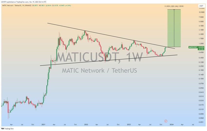 Недельный график показывает, что цена Polygon начала расти после прорыва нисходящей линии сопротивления в сентябре. В октябре темпы роста ускорились, что привело к достижению отметки $0,98 на прошлой неделе.