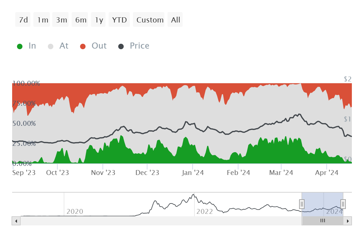 Показатель участия инвесторов в сети демонстрирует, что сейчас они не стремятся продавать свои токены. Ончейн-анализ активных адресов свидетельствует, что в прибыли находится менее 1%. Между тем обычно именно активные адреса в прибыли проводят в сети транзакции с намерением зафиксировать прибыль.