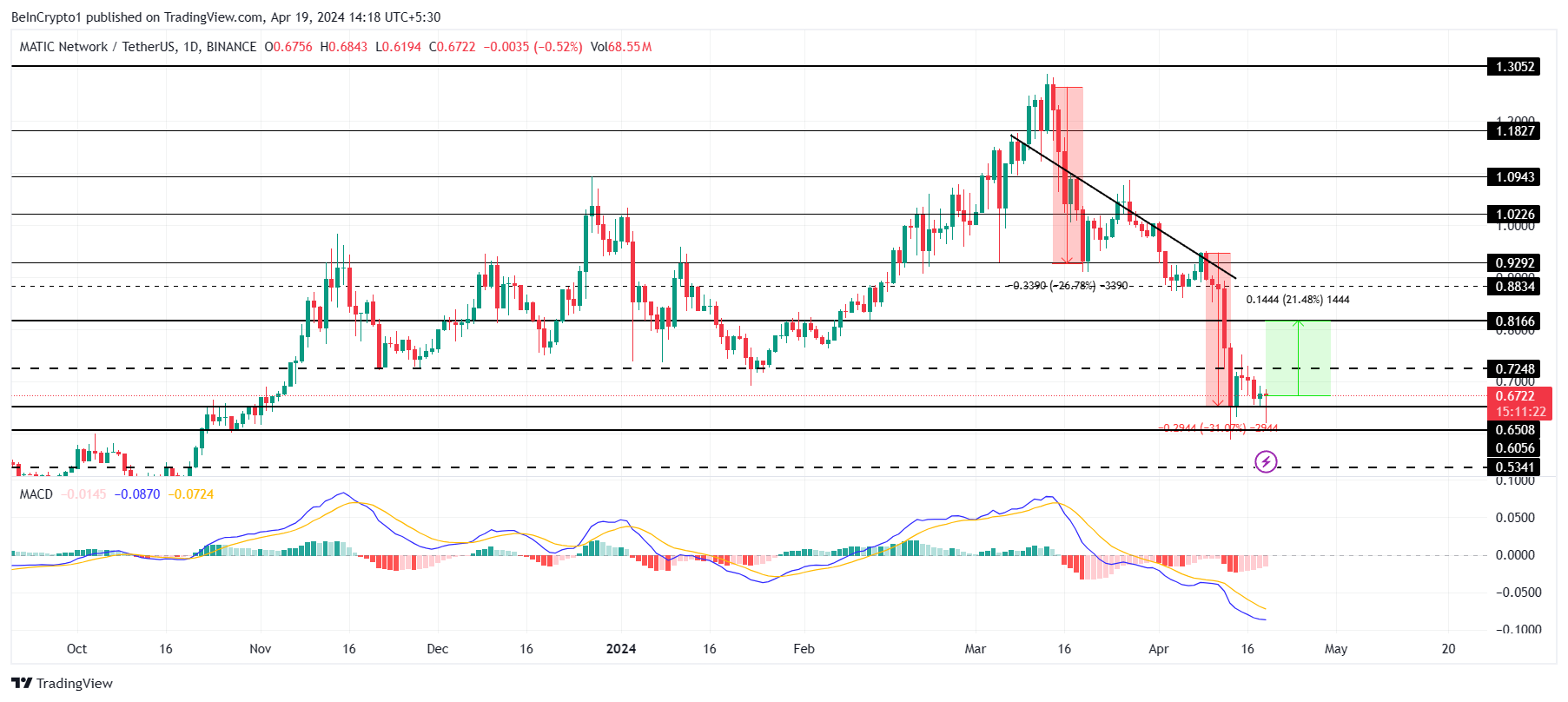 На момент написания цена совершала отскок от уровня поддержки $0,65 и была близка к прорыву сопротивления $0,70. Учитывая, что инвесторы жаждут роста цены, Polygon может нацелиться на сопротивление $0,81, при условии, что он превратит в поддержку отметку $0,70.