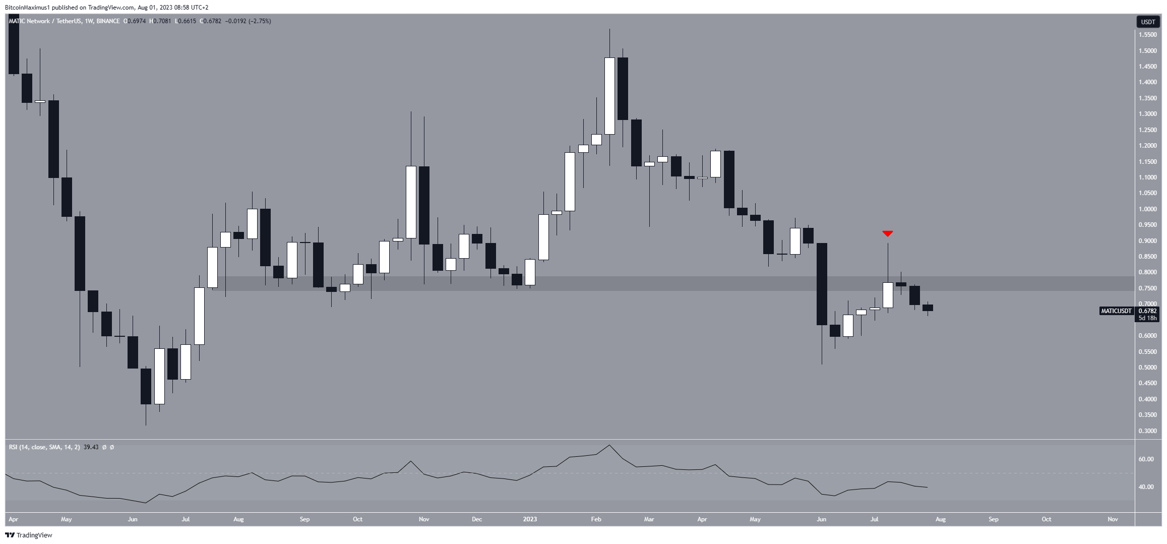 Технический анализ недельного таймфрейма дает неутешительный прогноз — прежде всего из-за недавнего отбоя от горизонтальной зоны сопротивления $0,80. Эта область выступала в качестве уровня поддержки с июля 2022 года, но в последние две недели стала сильным сопротивлением.