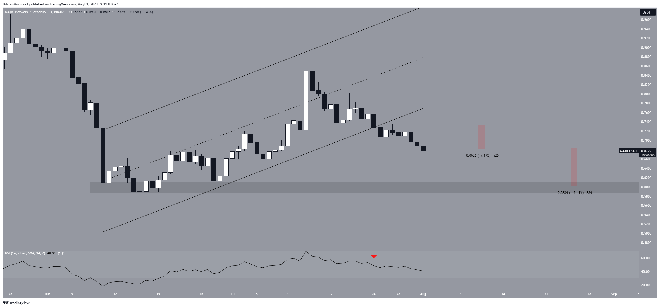 Дневной таймфрейм Polygon также дает медвежий прогноз. Основной причиной этого является пробой восходящего параллельного канала, существовавшего с 10 июня. Этот технический паттерн считается коррекционным, поэтому его пробой свидетельствует о завершении восходящей коррекции и возобновлении нисходящего тренда.