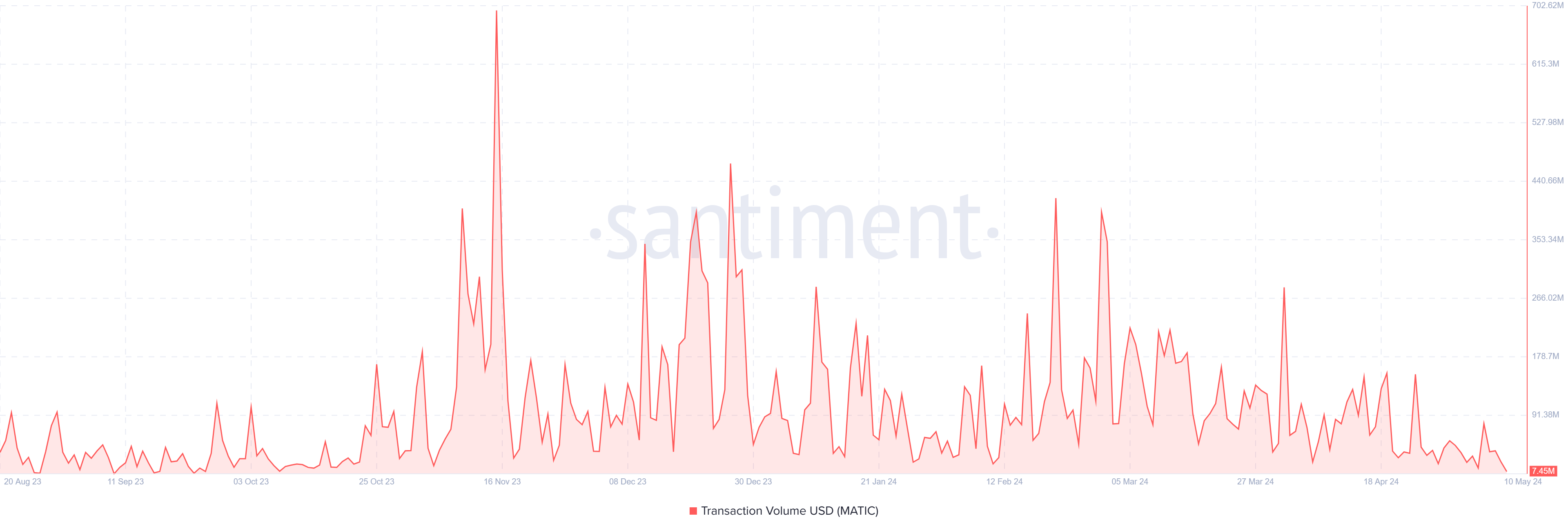 Однако отступают не только киты, но и розничные инвесторы. Это видно по резкому снижению объема транзакций. Держатели MATIC воздерживаются от активности, пока не увидят убедительных стимулов к участию в сети. За последние недели средний объем транзакций упал с $77 млн до $21 млн.
