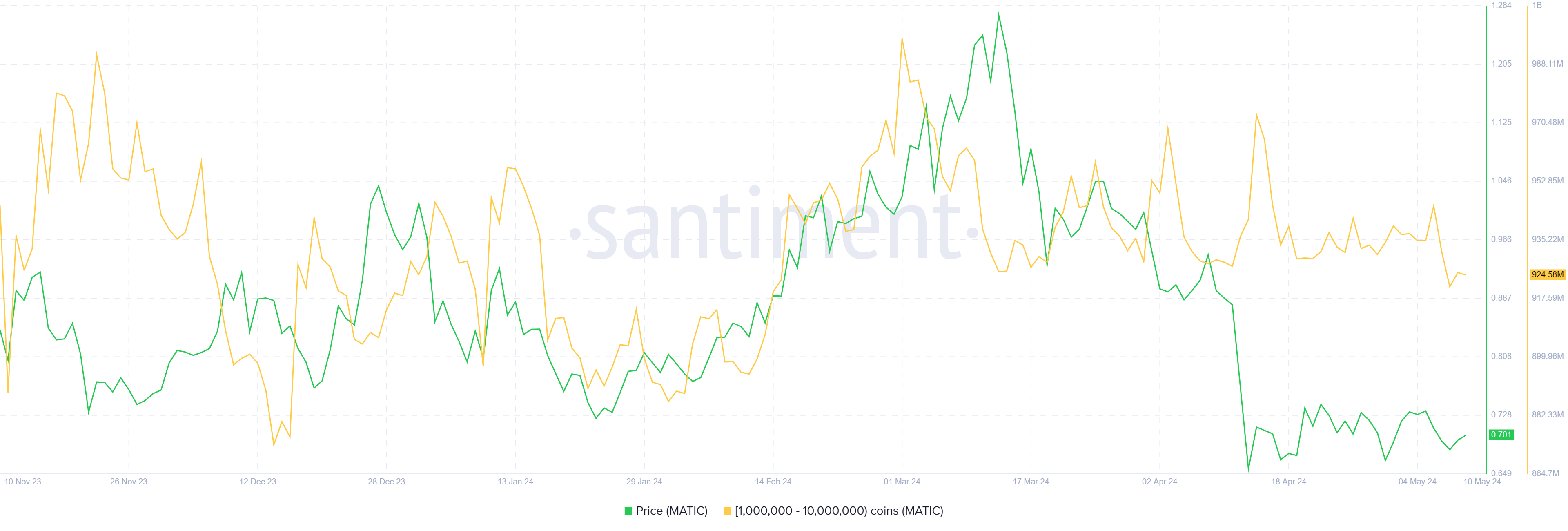Инвесторы теряют доверие к Polygon. Это видно по тому, как киты сбрасывают монеты в последние несколько дней. Всего за неделю адреса, держащие от 1 млн до 10 млн MATIC, продали более 21 млн токенов. В результате их запасы упали до трехмесячного минимума.