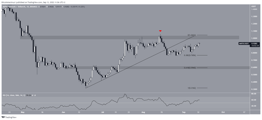 После этого MATIC прорвал линию восходящей поддержки, построенную от минимумов июня. С тех пор цена росла, однако возможно, что этот бычий ход представляет собой всего лишь повторное тестирование области $1 и линии восходящей поддержки.