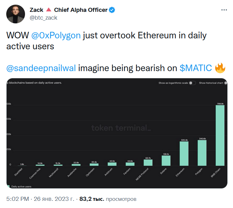 Этот рост происходит на фоне сообщений о новых достижениях, которых удалось добиться экосистеме Polygon. Так, стало известно, что суточный показатель активных пользователей на Polygon превысил аналогичный показатель Ethereum. Впрочем, оба блокчейна с большим отрывом отстают от BNB Chain, который является лидером на этом графике: