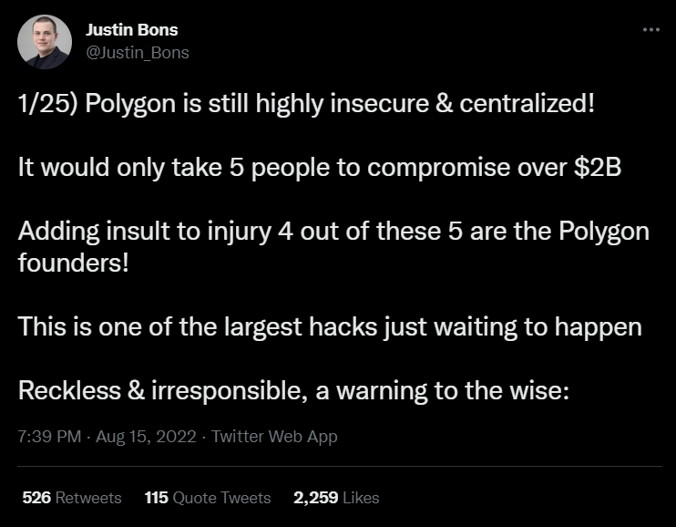 Сайдчейн Polygon чрезмерно централизован, что представляет беспрецедентные риски не только взлома, но и цензуры. Такое мнение в твиттере озвучил основатель венчурной фирмы Cyber Capital Джастин Бонс.