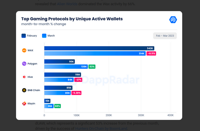 Согласно опубликованному аналитической платформой DappRadar отчету Blockchain Games Report, количество уникальных активных кошельков, участвующих в играх на Polygon, в марте достигло 138 081. Это на 53% больше, чем месяцем ранее.