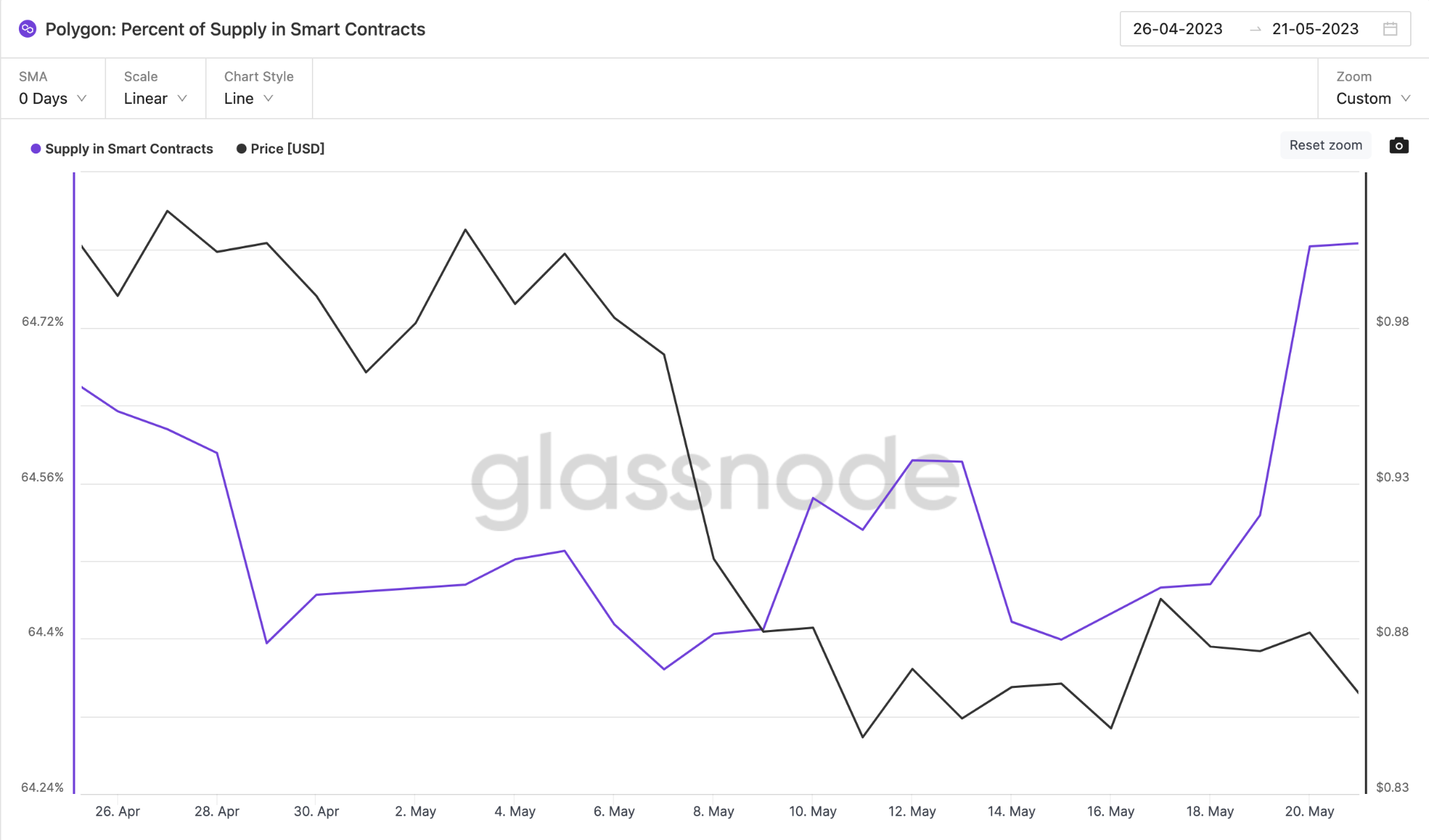 После значительного спада в начале мая держатели Polygon снова начали проявлять активность. Это может быть связано с тем, что они надеются получить прибыль от предстоящего аирдропа. На графике ниже показано, что в период с 14 по 22 мая инвесторы разместили в смарт-контрактах около 37 млн MATIC — примерно 0,4% от общего объема предложения.