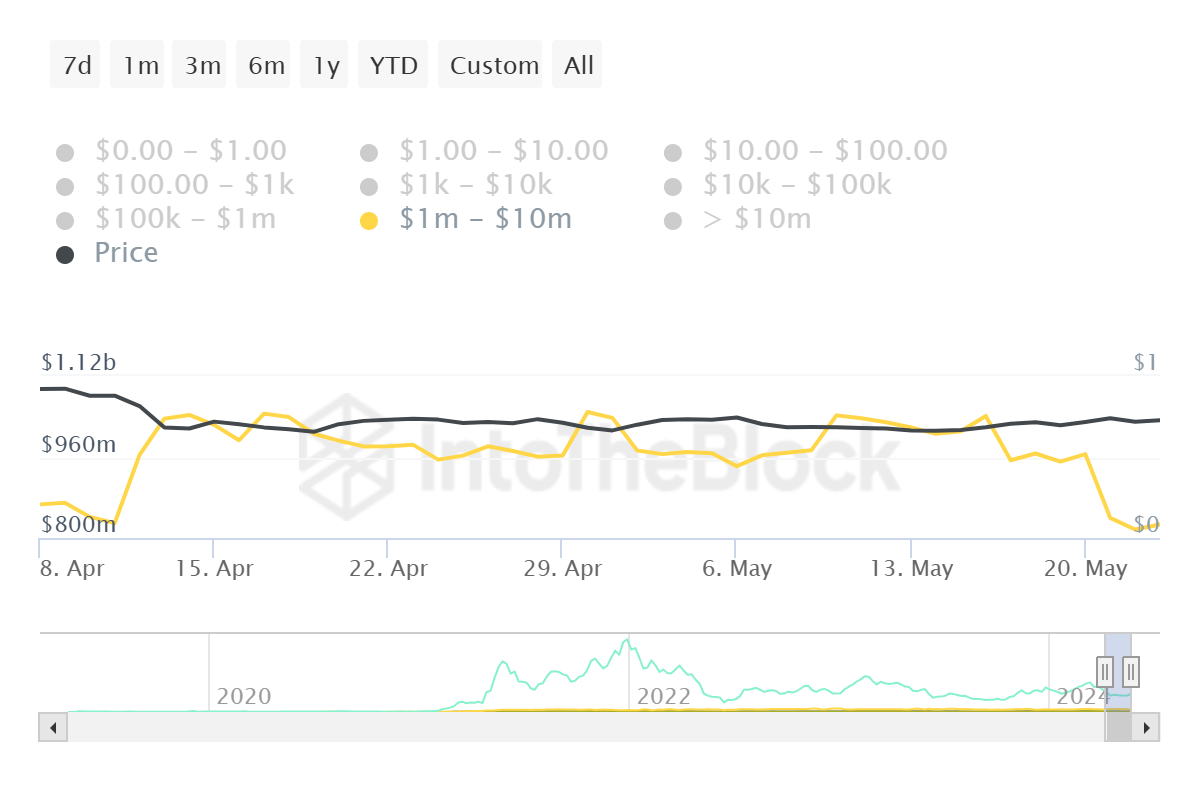 Однако крупные держатели проявляют пессимизм, склоняясь к продажам. Только за последнюю неделю адреса с балансом от $1 млн до $10 млн в Polygon избавились от монет примерно на $214 млн. Если тенденция сохранится, MATIC ждет неминуемая коррекция.