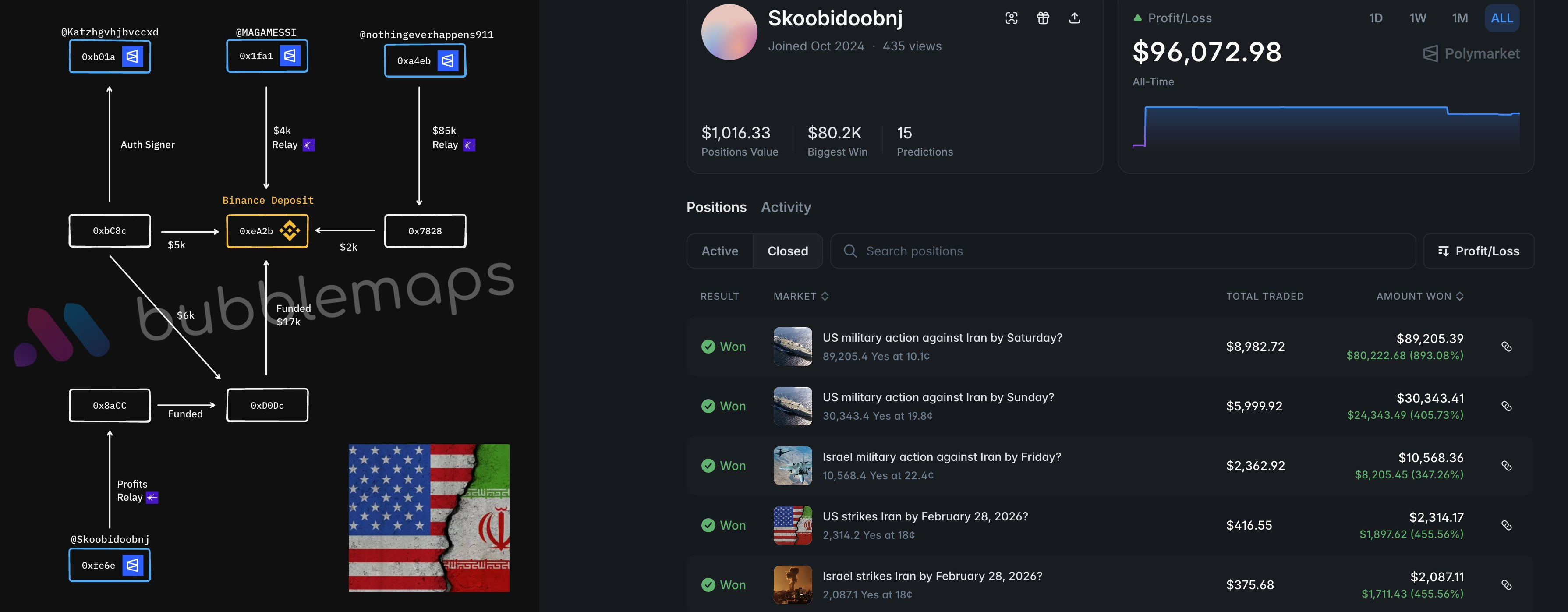 Bubblemaps также обнаружила еще два аккаунта на Polymarket, связанные со Skoobidoobnj. Один принес своему обладателю $65 000 на атаке США 28 февраля, другой — $10 000 на ударе Израиля 13 июня.