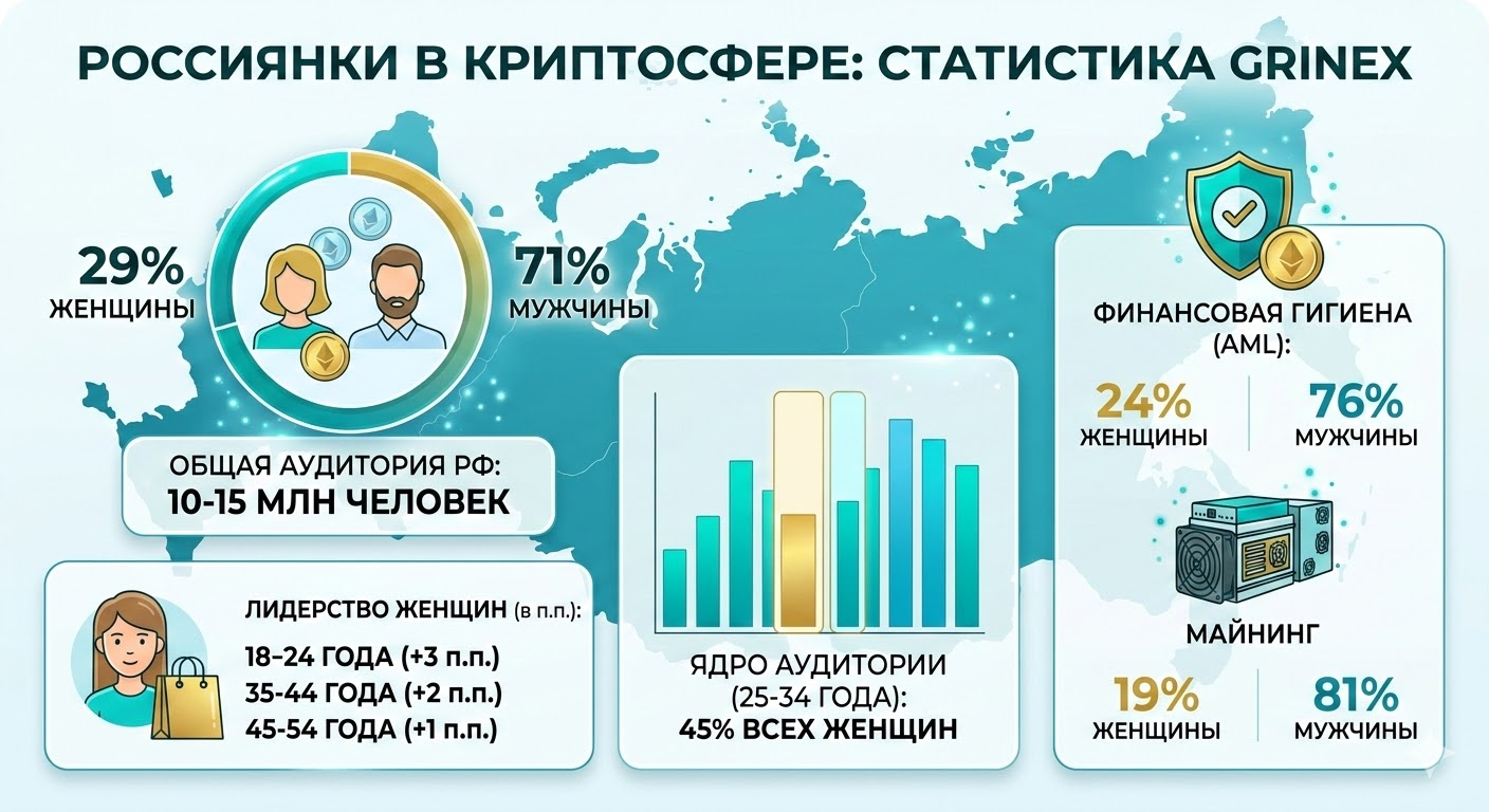 Россиянки активно осваивают рынок цифровых валют. В определенных возрастных группах они даже стали обходить мужчин по уровню вовлеченности. Согласно отчету биржи Grinex, который цитирует ТАСС, общая численность владельцев криптоактивов в стране составляет от 10 до 15 миллионов человек.