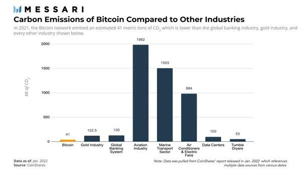 Ситуацию с углеродным следом визуализировали аналитики Messari. Они сравнили вред экологии от майнинга биткоина с другими бизнесами. Оказалось, что углеродный след от золотодобычи и даже от сушильных машин для белья больше, чем оставляет индустрия добычи криптовалюты.