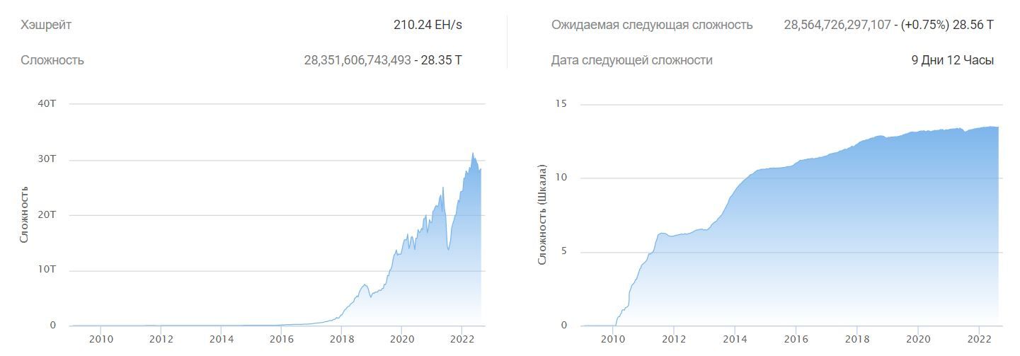 Вот как, по состоянию на момент написания обзора, выглядят графики хешрейта и сложности майнинга биткоина: