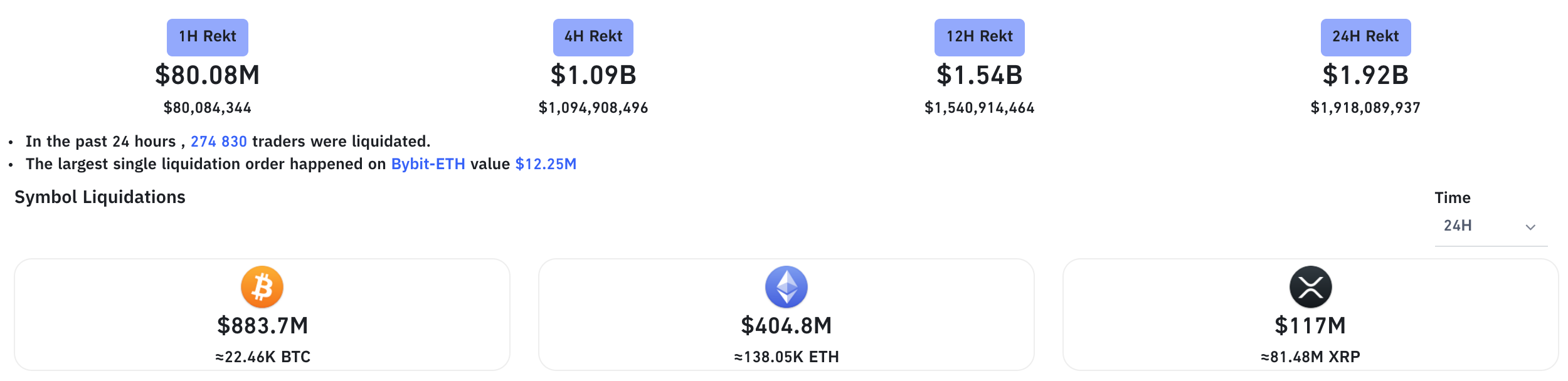 По данным аналитического сервиса Bybt.com, за минувшие сутки на рынке были ликвидированы позиции на сумму $1,9 млрд, при этом $1 млрд был ликвидирован за последние 4 часа. Лидером распродажи стал биткоин. На его долю пришлось почти $900 млн от общей суммы ликвидаций. На втором месте ETH с ликвидациями на сумму более $400 млн. Замыкает тройку лидеров XRP — $117 млн.