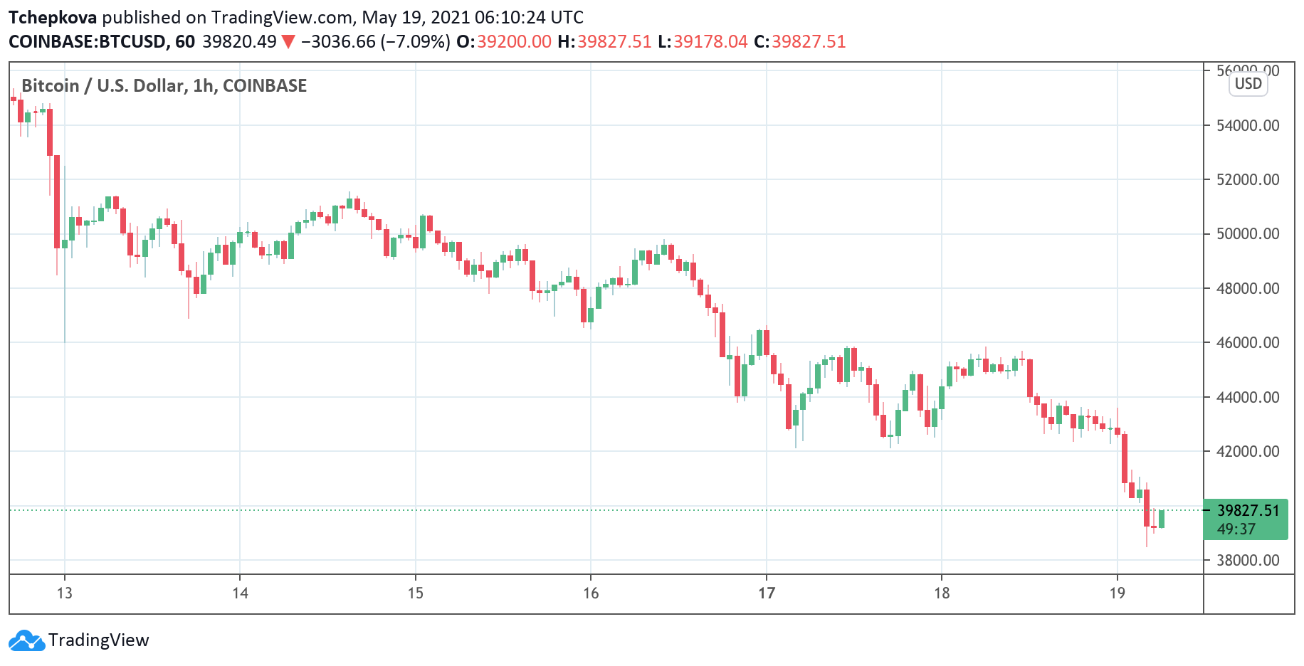 В считаные часы биткоин подешевел более чем на $4000 и протестировал минимум $38 500. Это самая низкая цена с начала февраля. За сутки главная криптовалюта потеряла 12%, а за неделю — более 30%. На момент написания статьи BTC/USD торгуется на уровне $39 500.