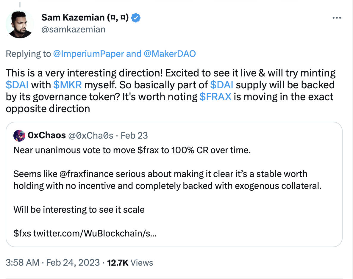 Тем не менее, у инициативы основателя MakerDAO нашлись и сторонники. Генеральный директор и создатель Frax Finance Сэм Каземиан заявил, что ему не терпится увидеть воплощение этой идеи и сминтить стейблкоин DAI с помощью MKR – даже несмотря на то, что FRAX движется в абсолютно противоположном направлении.