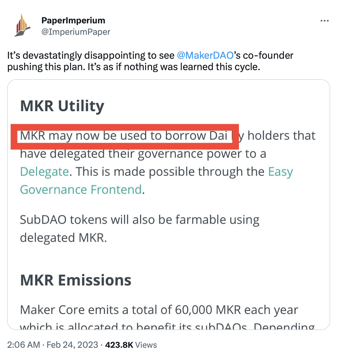 Пользователь «Твиттера» под ником PaperImperium, который освещает в своем аккаунте различные события из сферы DeFi, обратил внимание на часть представленного Кристенсеном документа. В нем говорится, что пользователи смогут брать взаймы стейблкоин DAI на делегированные токены MKR. Таким образом, MakerDAO рискует повторить ошибки последнего рыночного цикла.