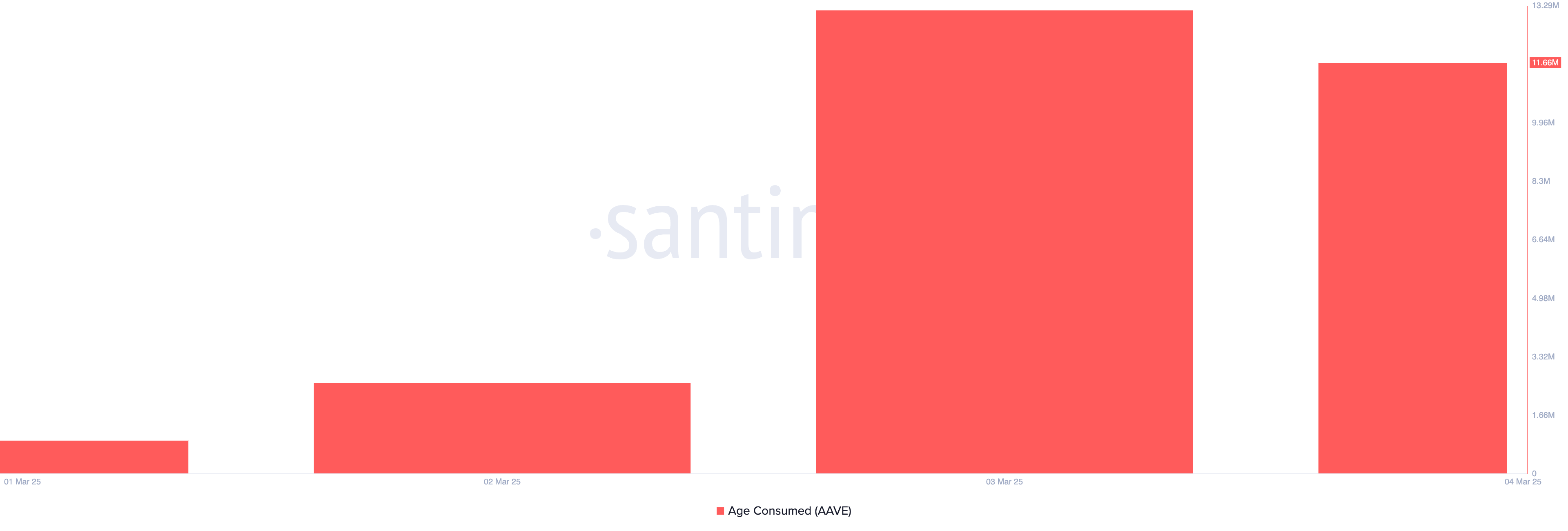 На фоне новой волны роста долгосрочные держатели AAVE перемещают свои монеты — это видно во всплеске метрики age-consumed, которая измеряет движение долго удерживаемых монет. По данным Santiment, во вторник показатель составил 11,66 млн.