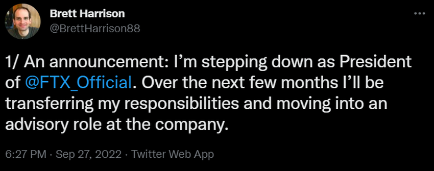 Президент FTX.US Бретт Харрисон покинет свой пост к концу 2023 года. Об этом он написал в твиттере.