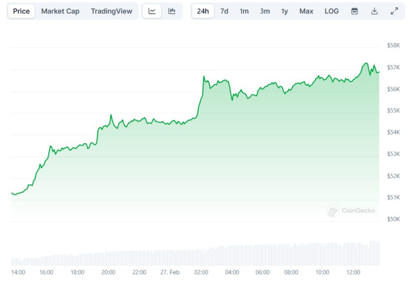 В ночь с 26 на 27 февраля курс BTC пробил максимум декабря 2021 года, поднявшись выше $57 тыс. По данным CoinGecko, за последние сутки актив подорожал на 10,9%. На момент написания материала биткоин торгуется по $56 900.