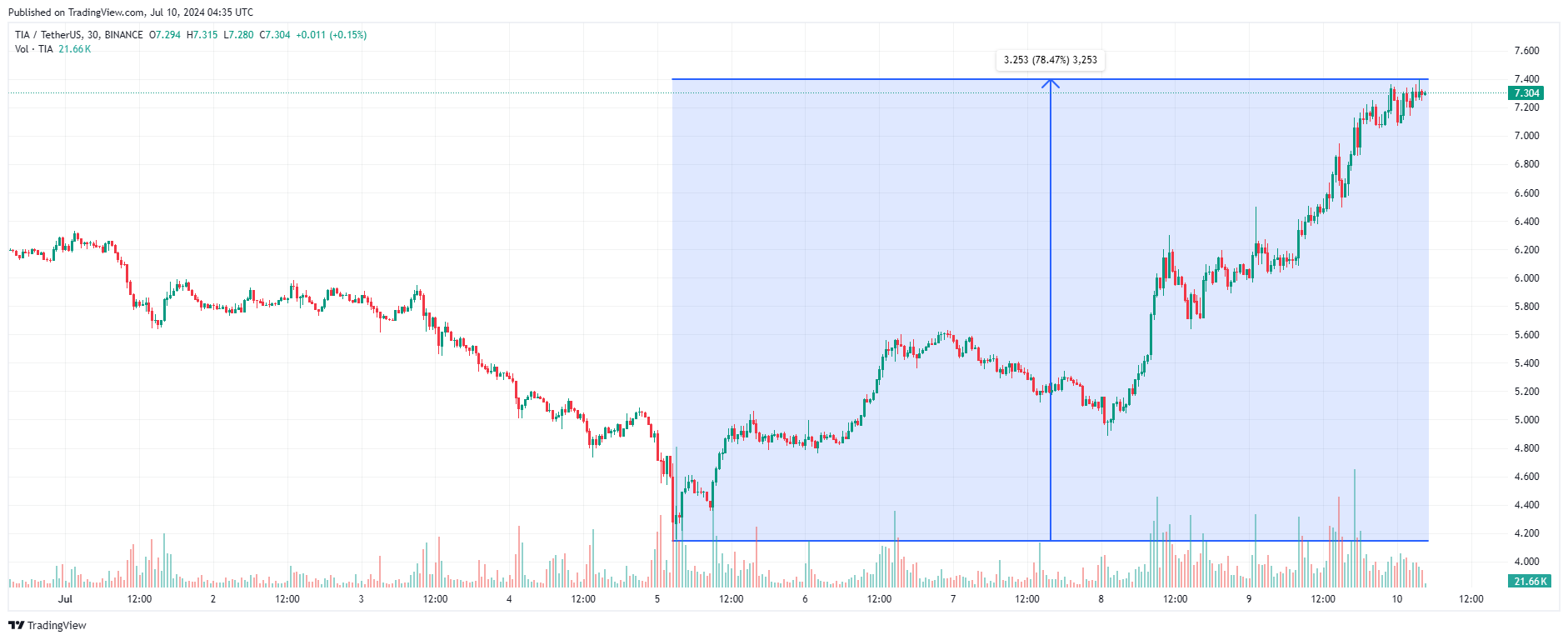 С 5 июля 2024 года криптовалюта Celestia (TIA) подорожала почти на 80%. Для сравнения, рост биткоина за аналогичный временной промежуток составил 10%, а Ethereum — 11%. По состоянию на момент написания обзора, TIA торгуется по $7,3.