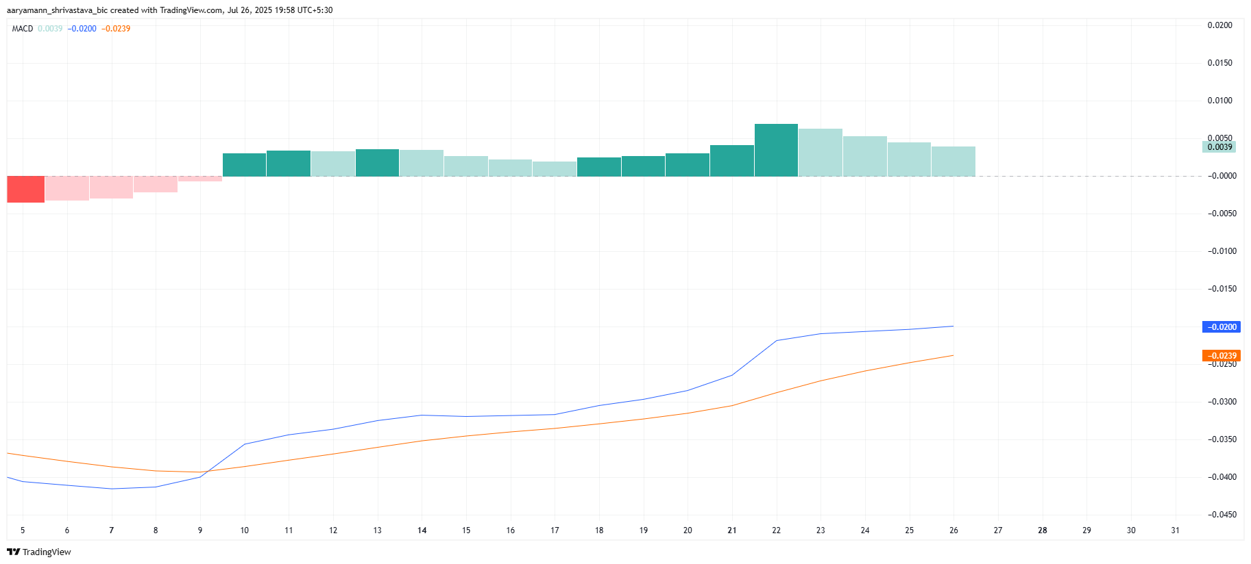 На рынке токена Pi на момент написания этого анализа царят позитивные настроения: индикатор MACD указывает, что медвежий импульс еще не набрал силу, поэтому у криптовалюты есть время на восстановление. На это намекают зеленые свечи на гистограмме ниже.