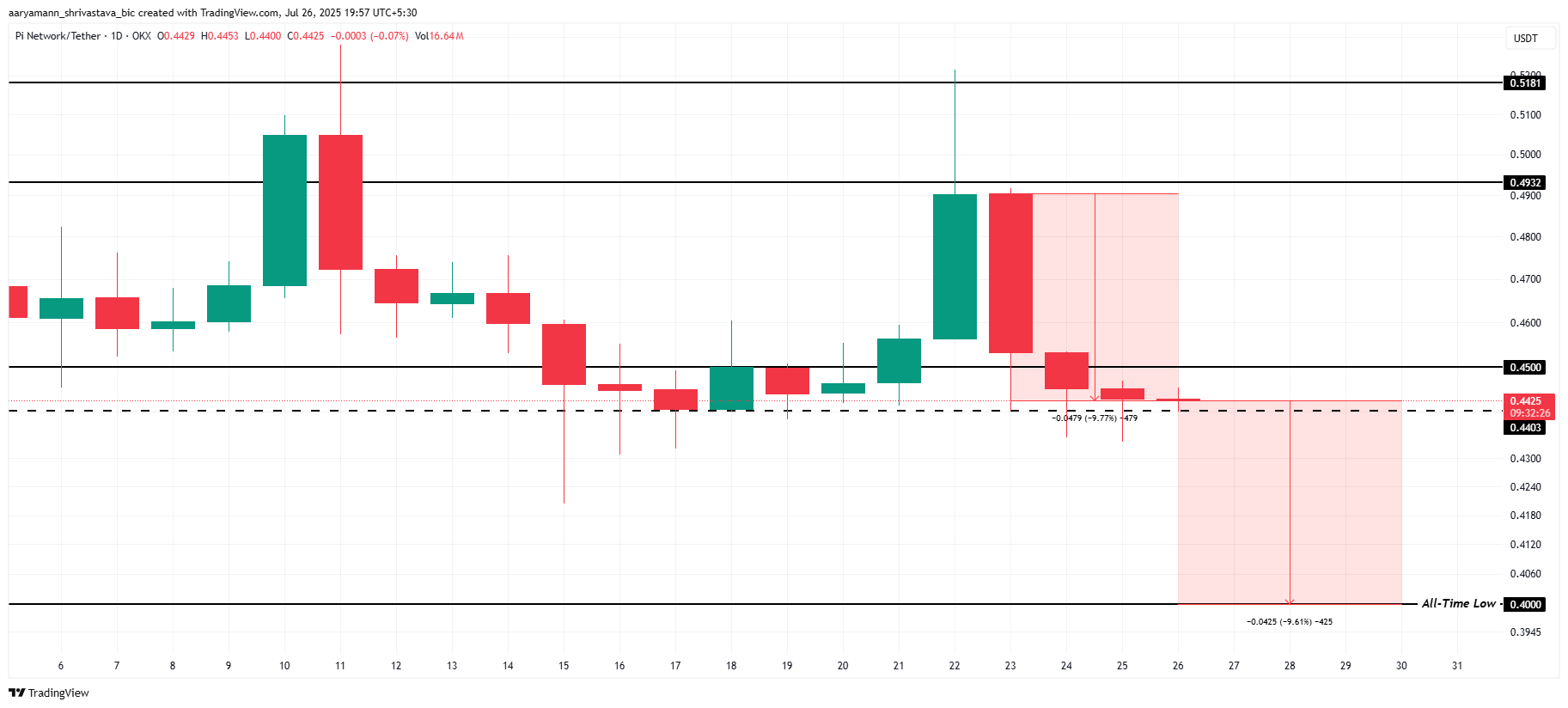 Цена Pi Coin упала на 9,7% за последние четыре дня и на момент написания торгуется по $0,442. Недавно она приблизилась к локальной поддержке на $0,440. Если токен сумеет отскочить от уровня и закрепиться выше $0,450, то он получит шанс начать новую волну роста. В таком случае цена альткоина сможет подняться к $0,493, что позволит ему отыграть часть недавних потерь.
