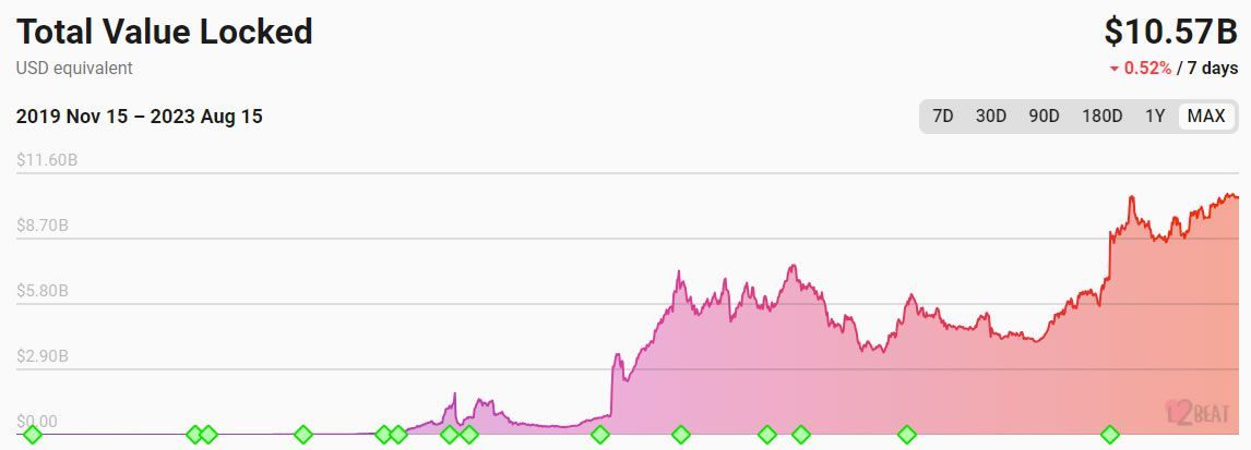 Несмотря на ослабление криптовалютного рынка, экосистема второго уровня за последние два года пережила взрывной рост. По данным L2beat, только в этом году общий объем закрытых сделок вырос на 158% и достиг рекордного уровня в $10,6 млрд.