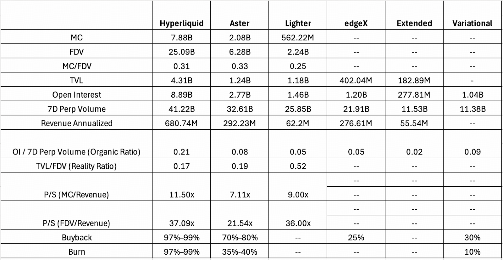 Сегмент децентрализованных бирж бессрочных контрактов все больше превращается в товарный рынок. В стремлении захватить долю рынка новые участники, такие как Extended, Lighter и Variational, практически обнулили комиссии для розничных трейдеров. Краткосрочно это способствует росту пользовательской базы, но одновременно сжимает выручку и ослабляет модели buyback-and-burn. В отличие от Hyperliquid, чей устойчивый денежный поток напрямую поддерживает ценность токена, большинство новых площадок не располагают достаточной выручкой для агрессивных механизмов накопления стоимости.