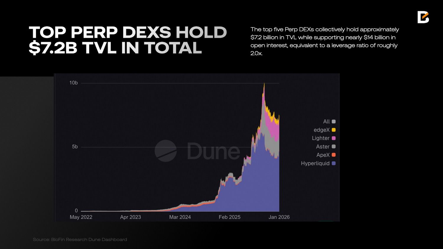 Несмотря на быстрый рост, капитальная база таких бирж остается структурно ограниченной. Пять крупнейших платформ удерживают около $7 200 000 000 TVL при открытом интересе почти $14 000 000 000, что соответствует плечу примерно 2.0x. Для сравнения, у Binance размещено свыше $200 000 000 000 капитала при OI около $30 000 000 000. Такая разница отражает существенно более низкую способность децентрализованных площадок поглощать риски.