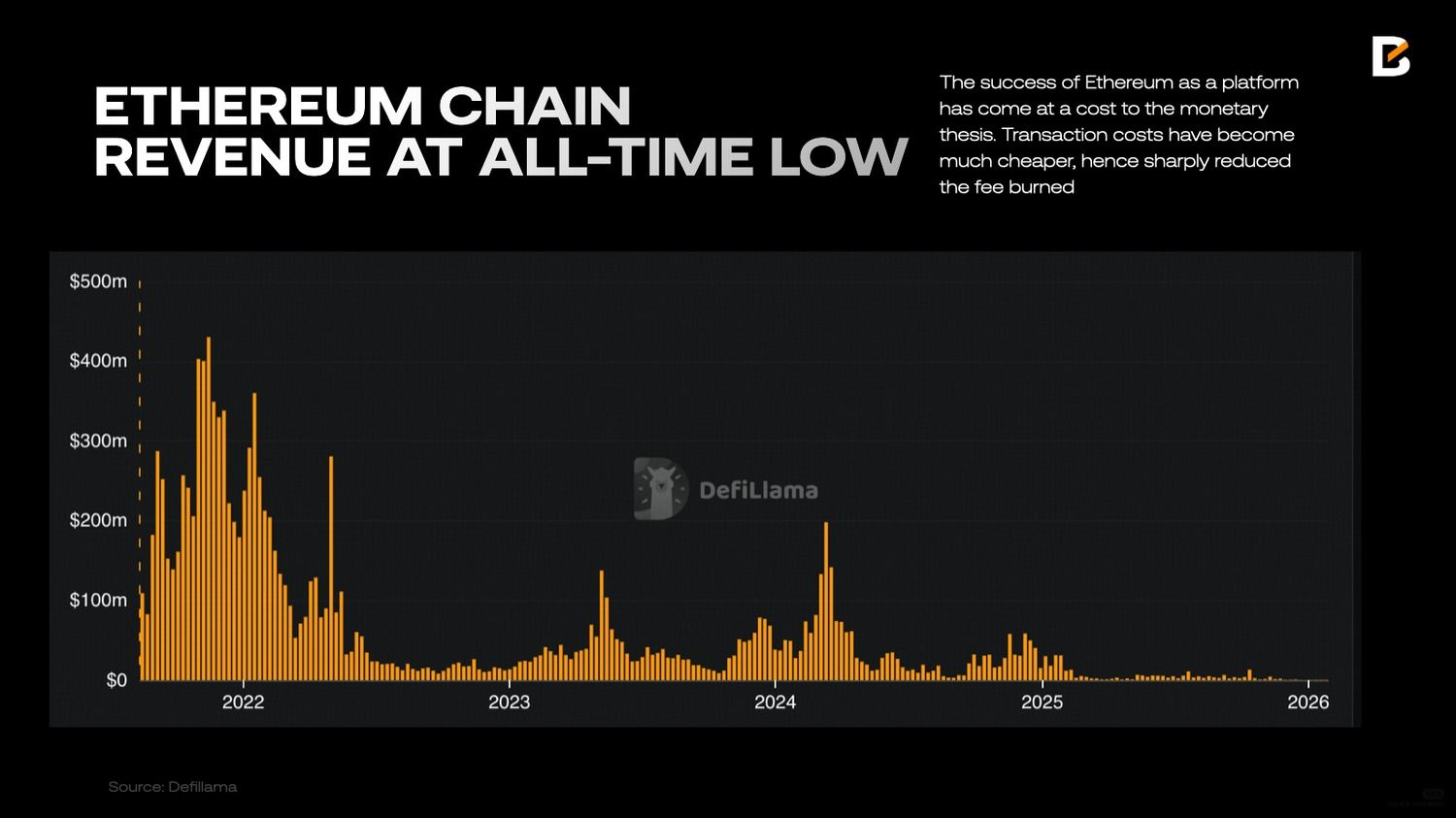 Хотя Ethereum по-прежнему выигрывает за счет децентрализации, экосистемы разработчиков и сетевых эффектов, большинство Layer 1 конкурируют по схожим техническим параметрам: времени блока, пропускной способности и стоимости транзакций. В результате экономическая ценность блокчейн-пространства все больше приближается к предельной себестоимости его обслуживания.