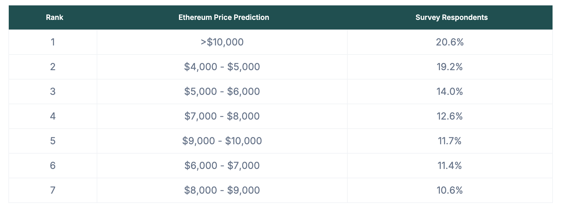 Результаты по Ethereum демонстрируют более широкий разброс ожиданий. Наиболее распространенный прогноз, который поддерживают 20,6% опрошенных, предполагает, что цена ETH превысит $10 тыс.