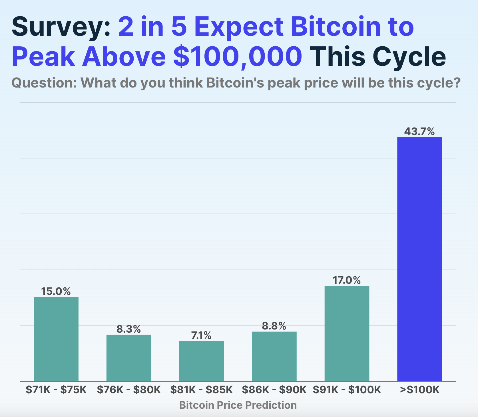 Значительные 43,7% из опрошенных криптоэнтузиастов считают, что в текущем цикле цена биткоина может превысить $100 тыс. Это мнение особенно распространено среди опытных инвесторов. Примерно половина участников, которые переживают уже второй бычий рынок (50,5%), а также ветераны индустрии верят, что BTC действительно достигнет такой отметки.