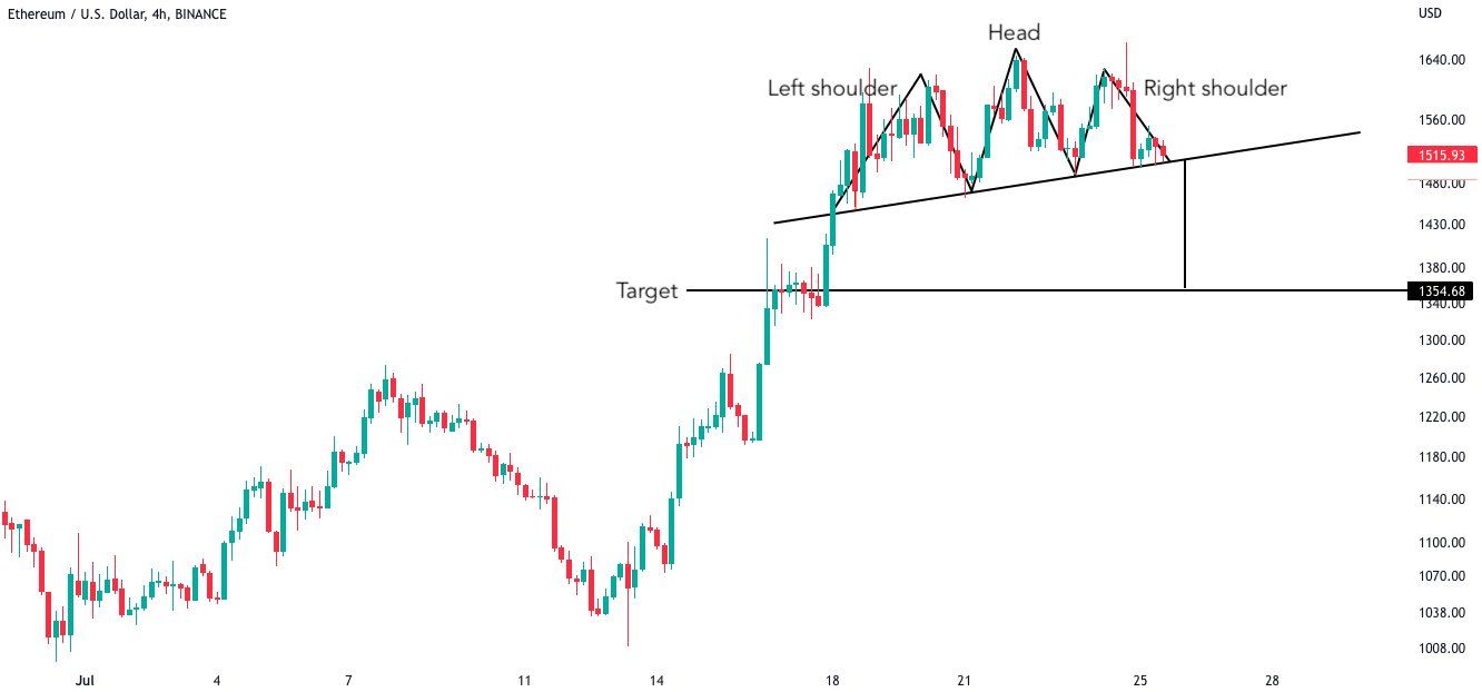 На графике второй по капитализации криптовалюты Ethereum пользователи сети видят сигналы, которые могут указывать на подготовку монеты к падению. На потенциал снижения курса цифрового актива, как считают инвесторы, указывает завершение фигуры «голова, плечи».