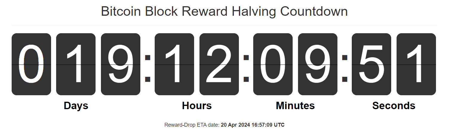 По данным bitcoinblockhalf, халвинг биткоина состоится через 19 дней — 20 апреля 2024 года.