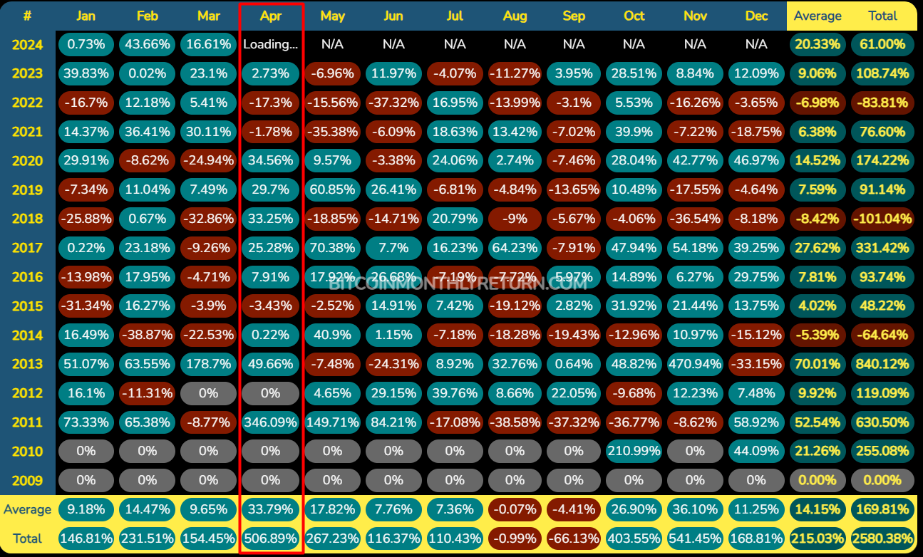 История наблюдений показывает, что апрель — один из лучших месяцев для биткоина. За последние 13 лет наблюдений монета только три раза продемонстрировала отрицательную динамику в этом месяце.