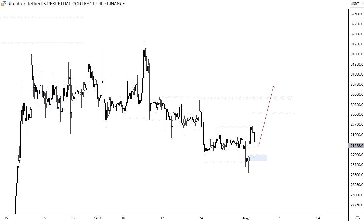 В случае, если криптовалюте не удастся реализовать рост, в ближайшие дни она может отправиться на $28 400. Такой прогноз курса биткоина представил трейдер Daan Crypto Trades.