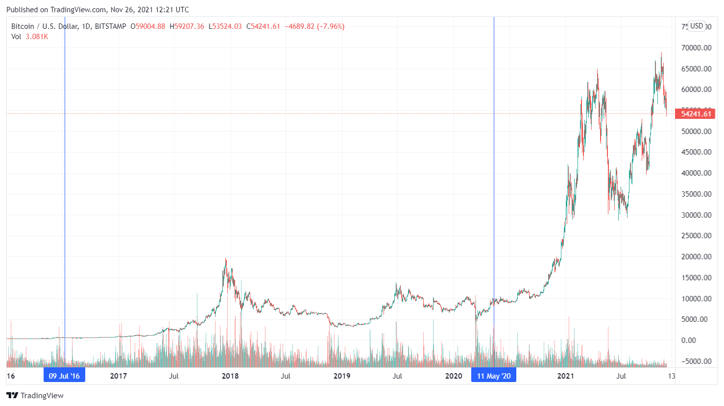 После скорость высвобождения BTC вновь снижается (происходит халвинг), и количество покупателей опять начинает перевешивать объем доступных для приобретения монет. Как итог, биткоин получает возможность возобновить рост.