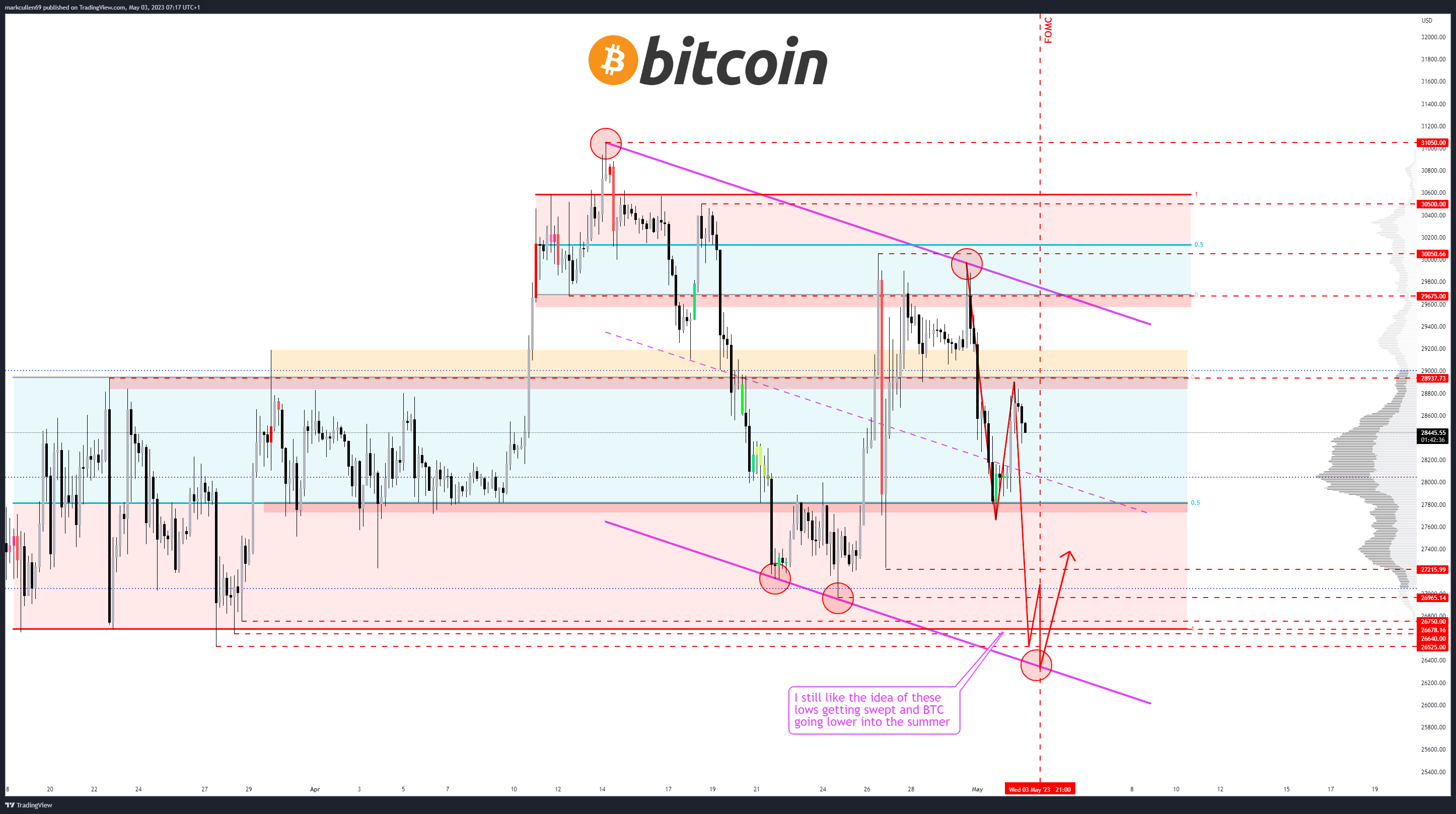 Потенциал дальнейшего снижения BTC также видит аналитик Марк Каллен. Его прогноз биткоина, основанный на результатах технического анализа, не исключает снижение криптовалюты к $26 тыс.