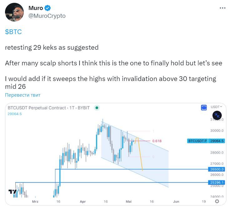 Впрочем, есть и негативные мнения. Например, прогноз биткоина криптотрейдера @MuroCrypto не исключает снижение к $26 тыс. с потенциалом дальнейшего падения. На вероятность такого движения, по его мнению, указывают результаты технического анализа.