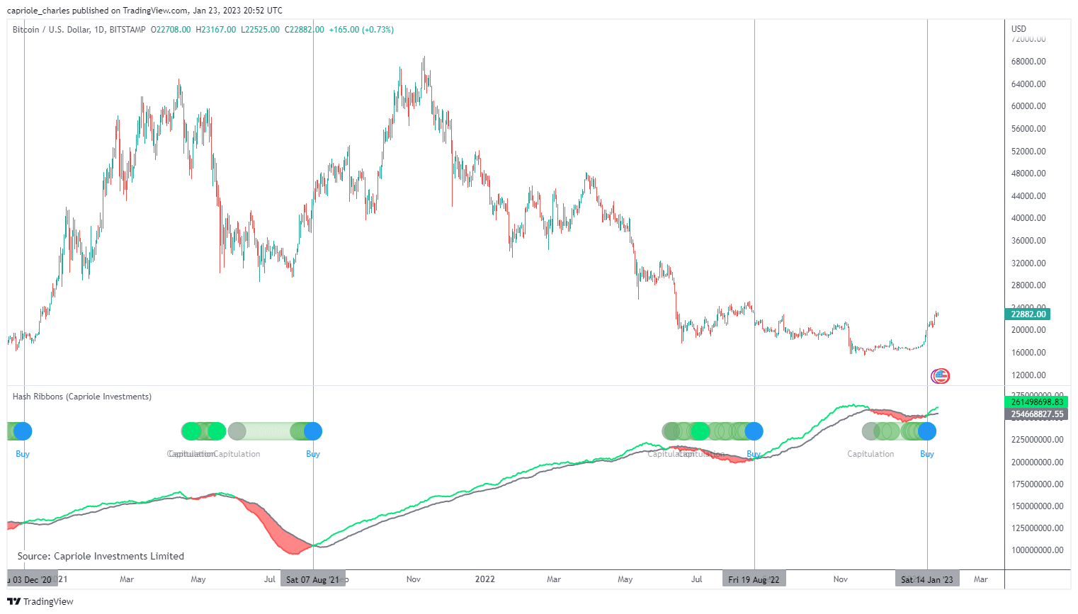 Основатель Capriole Investments Чарльз Эдвардс считает, что биткоин уже достиг минимума на фоне краха криптобиржи FTX в ноябре 2022 года. Он также обратил внимание на сигналы индикатора Hash Ribbons, который помогает определять циклическое дно. На фоне выхода BTC в рост инструмент дал сигнал на покупку.
