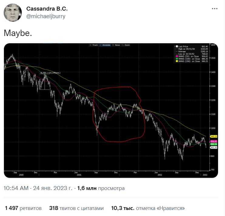 SponsoredЛожку дегтя добавил американский финансист Майкл Бьюрри, которому удалось верно предсказать обвал рынка недвижимости в США перед мировым финансовым кризисом 2008–2009 годов. Он отметил, что ранее в истории рынка уже были периоды, когда позитивный, на первый взгляд, рост S&P 500 завершался выходом индекса к новым минимумам.