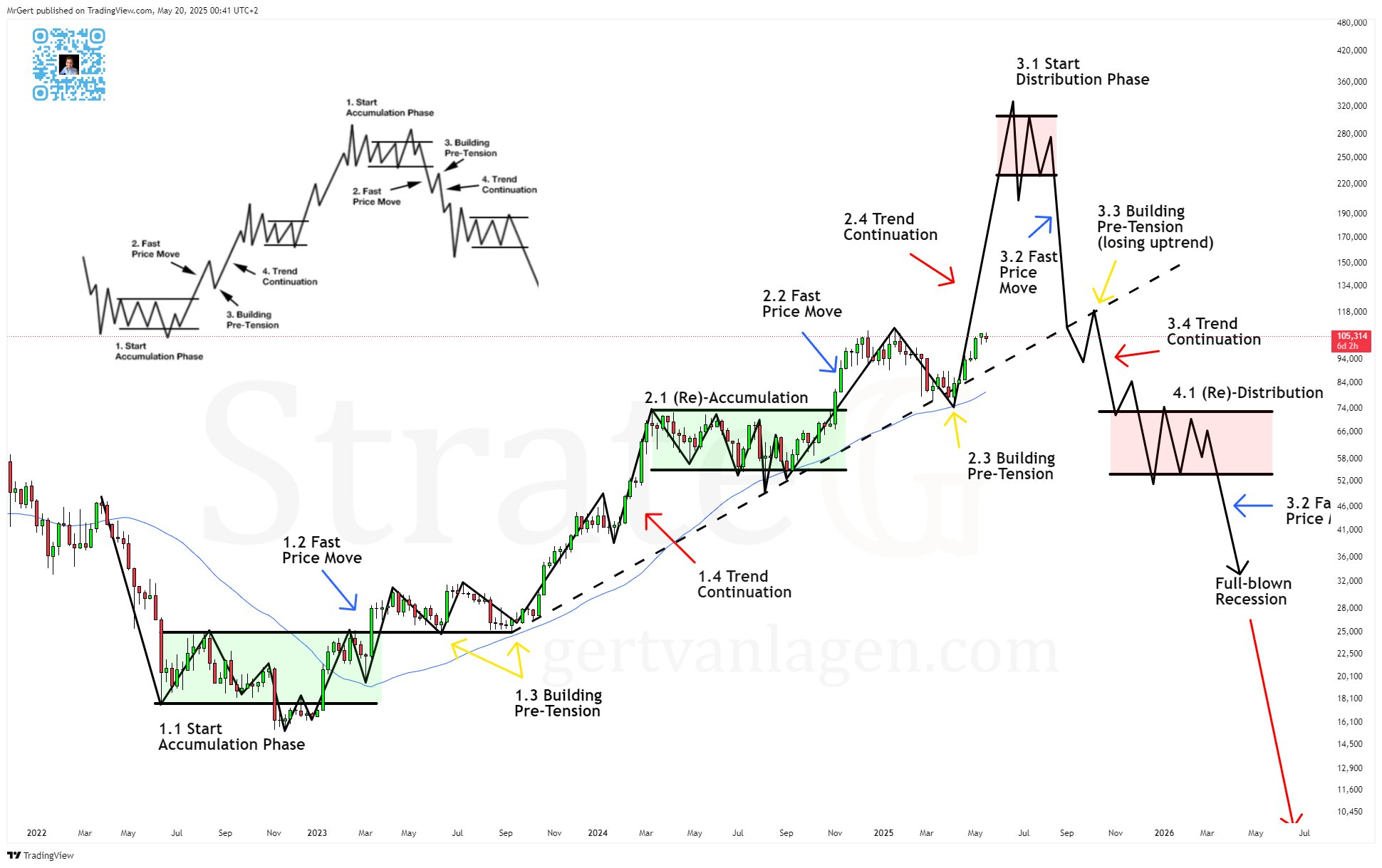 Аналитик Герт Ван Лагген в свою очередь считает, что в июне не исключен биткоин по $150 000 и даже по $170 000. В своем X он опубликовал анализ графика биткоина по модели Ричарда Вайкоффа (Wyckoff Price Cycle), согласно которой весь рыночный цикл делится на фазы: