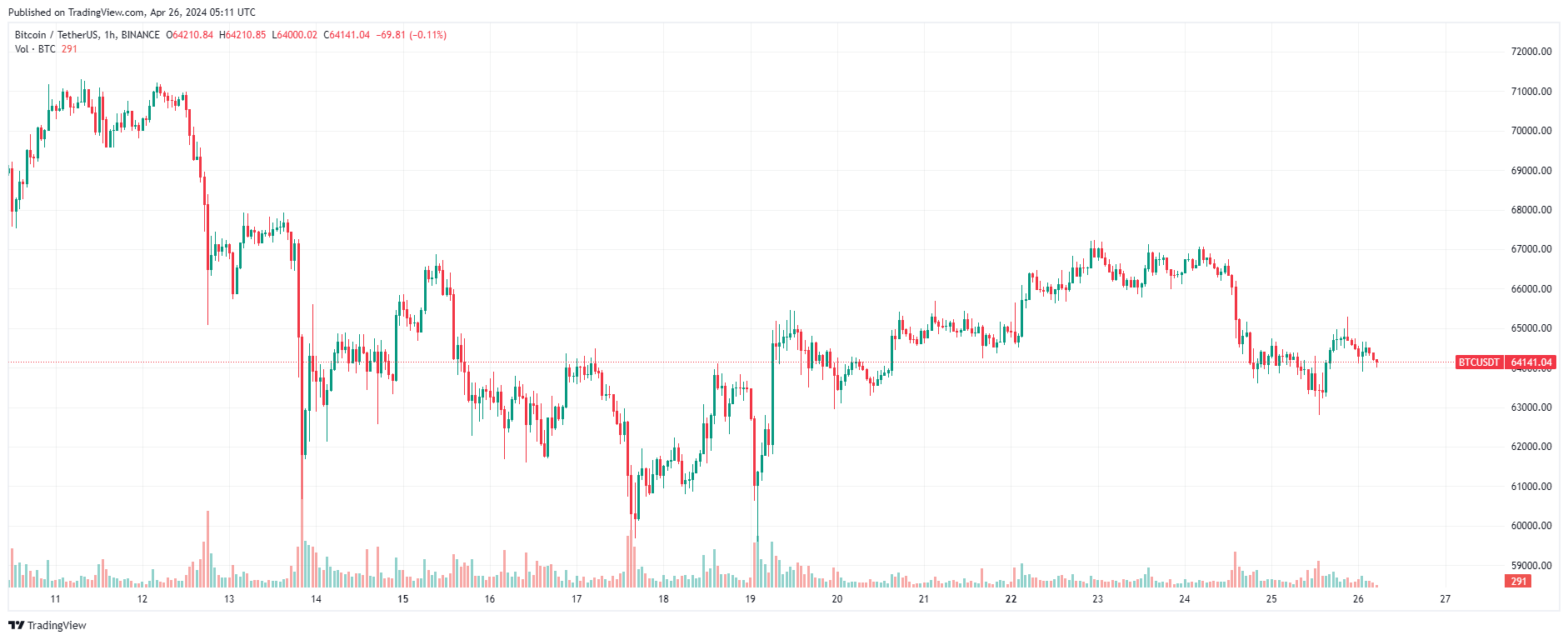 Пятницу 26 апреля биткоин встретил близ уровней, на которых состоялся четвертый по счету халвинг BTC. По состоянию на момент написания обзора, монета торгуется по $64 141.