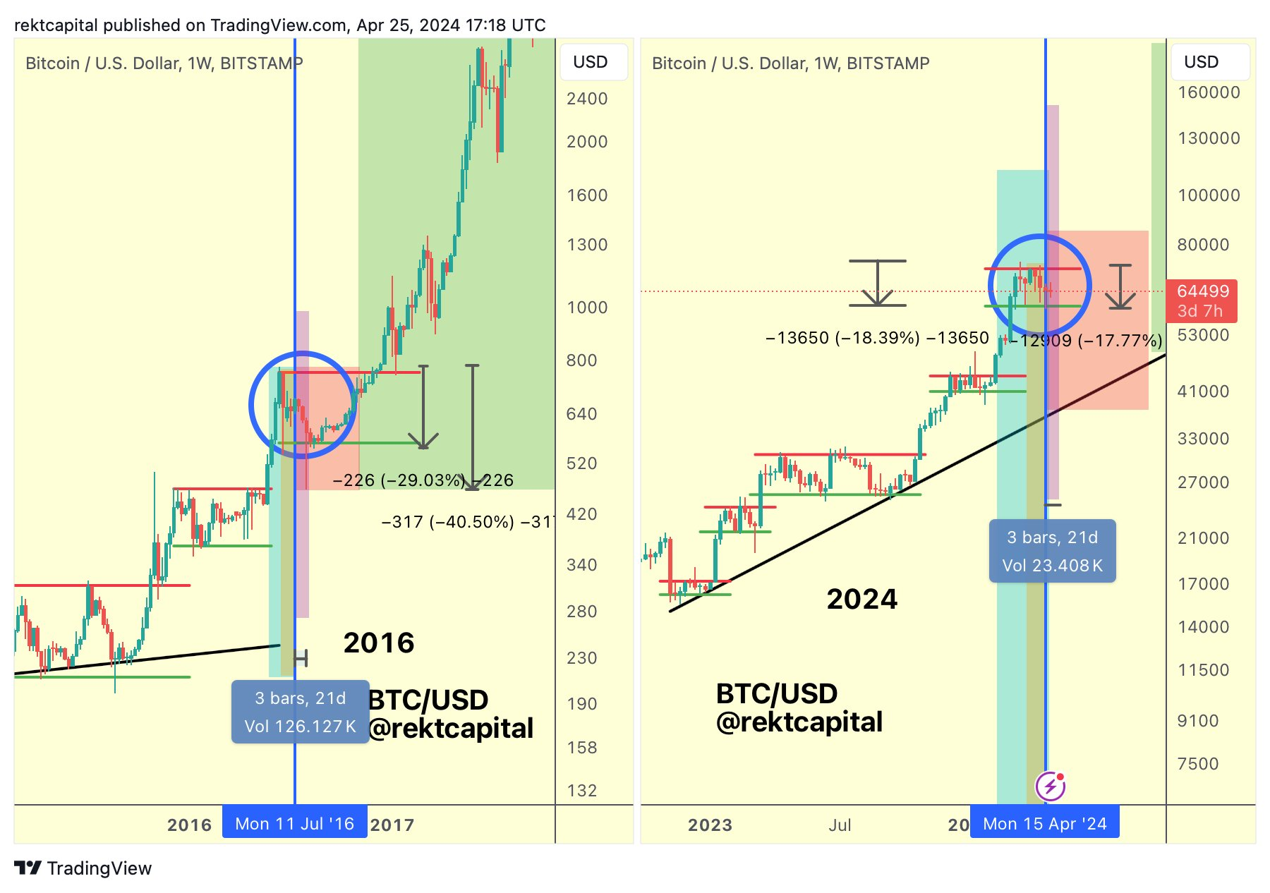 Перспективы падения BTC также видит криптотрейдер Rekt Capital. Он считает, что криптовалюта может повторить сценарий с коррекцией 2016 года.
