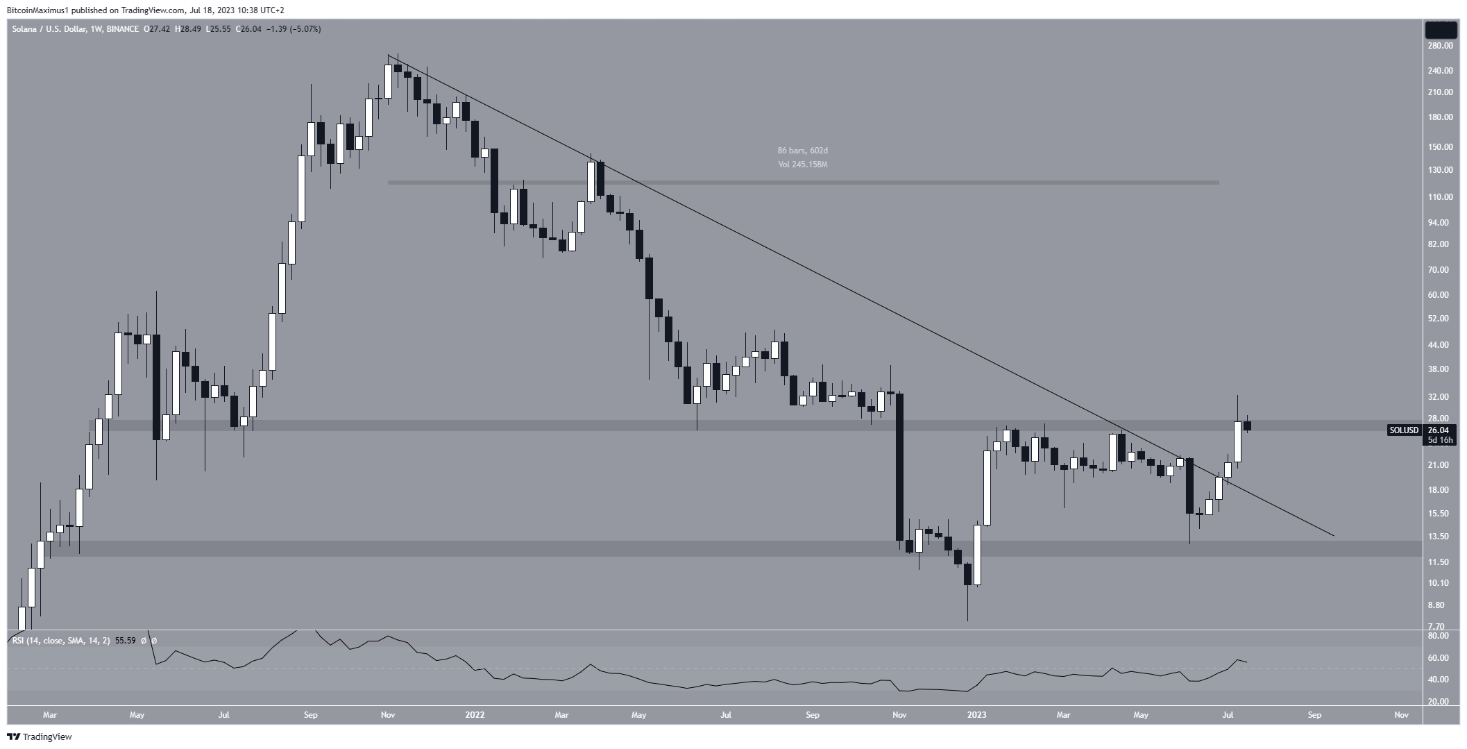 Технический анализ недельного таймфрейма показывает, что две недели назад SOL совершила значительный прорыв, преодолев нисходящую линию сопротивления, которая существовала с ноября 2021 года и охватывала период в 600 дней.