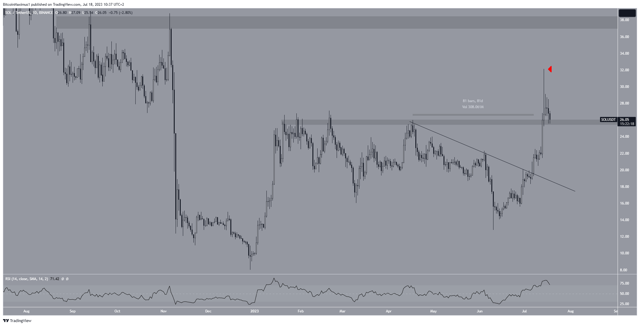 Вероятность еще более усилилась после того, как SOL вернулась к горизонтальной области $26, которая, как ожидается, теперь будет служить поддержкой.