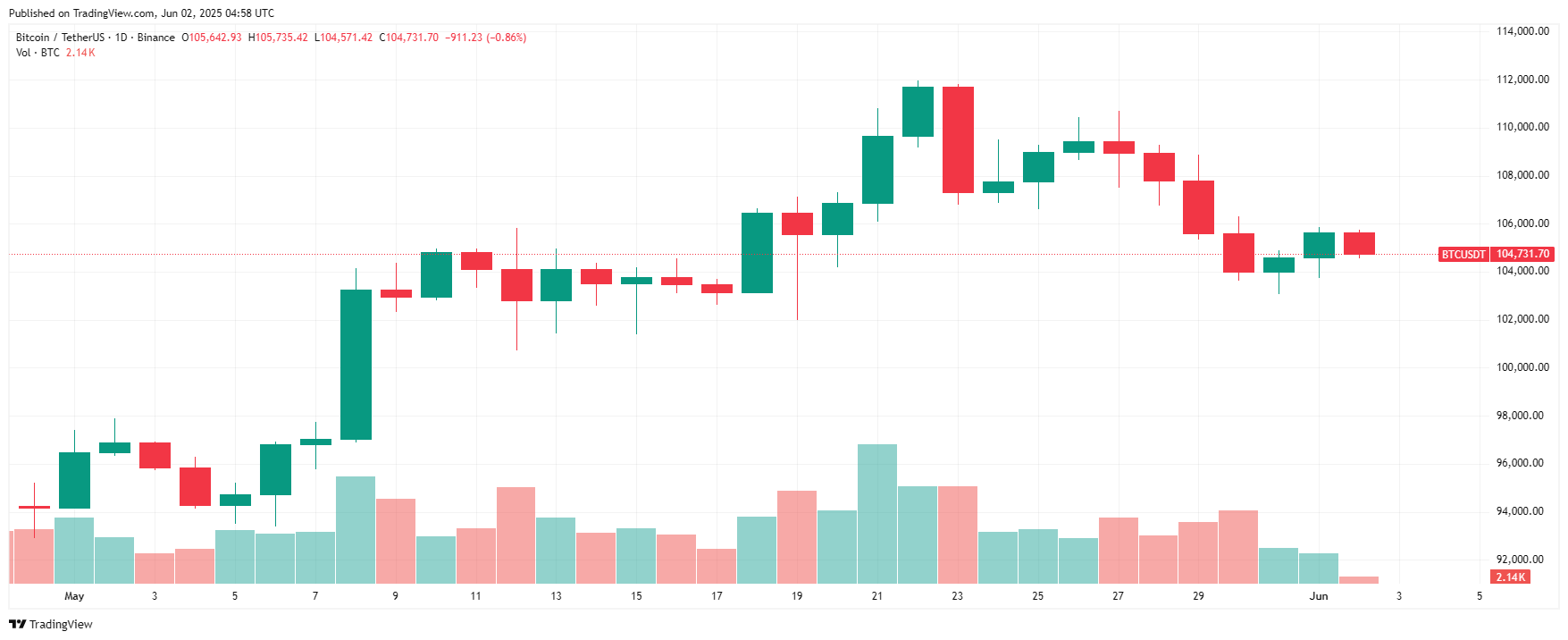Биткоин начал май с торгов близ $94 000. 21 мая BTC обновил январский максимум и продолжил расти. На момент написания обзора, ATH биткоина зафиксирован 22 мая на уровне $111 970. После обновления максимума криптовалюта скорректировалась. 31 мая BTC встретил в диапазоне $103 143-$104 855. В этом месяце победил чуть более скептично настроенный ChatGPT.