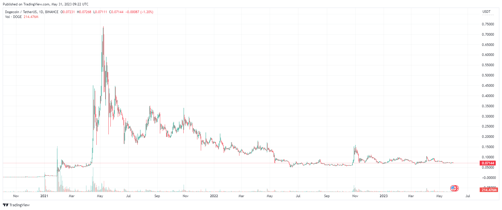 Dogecoin (DOGE) — любимая криптовалюта основателя Tesla Илона Маска. Проект стал ярким примером мемкоина, который, несмотря на отсутствие каких-либо уникальных технических решений и жесткую конкуренцию, смог закрепить за собой место в десятке самых капитализированных криптовалют. Редакция BeInCrypto решила выяснить, каким может быть первый месяц лета для DOGE. Для этого мы попросили опытных экспертов дать прогноз Dogecoin на июнь 2023